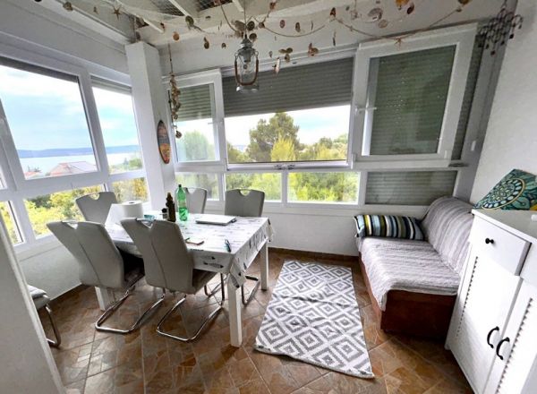 Spodní patro (2. patro): obývací pokoj s kuchyní a jídelním koutem, 2 ložnice, koupelna, lodžie (uzavřená) s výhledem na moře
