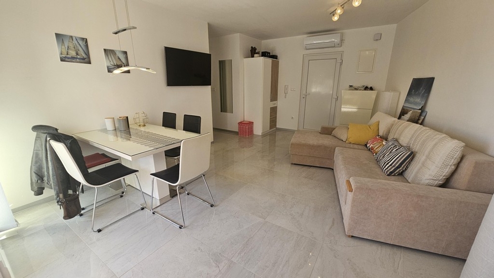 Tento atraktivně zařízený přízemní apartmán se zahradou a krásným výhledem na moře je na prodej v atraktivní lokalitě nedaleko Njivice, ostrov Krk (mostové spojení s pevninou).